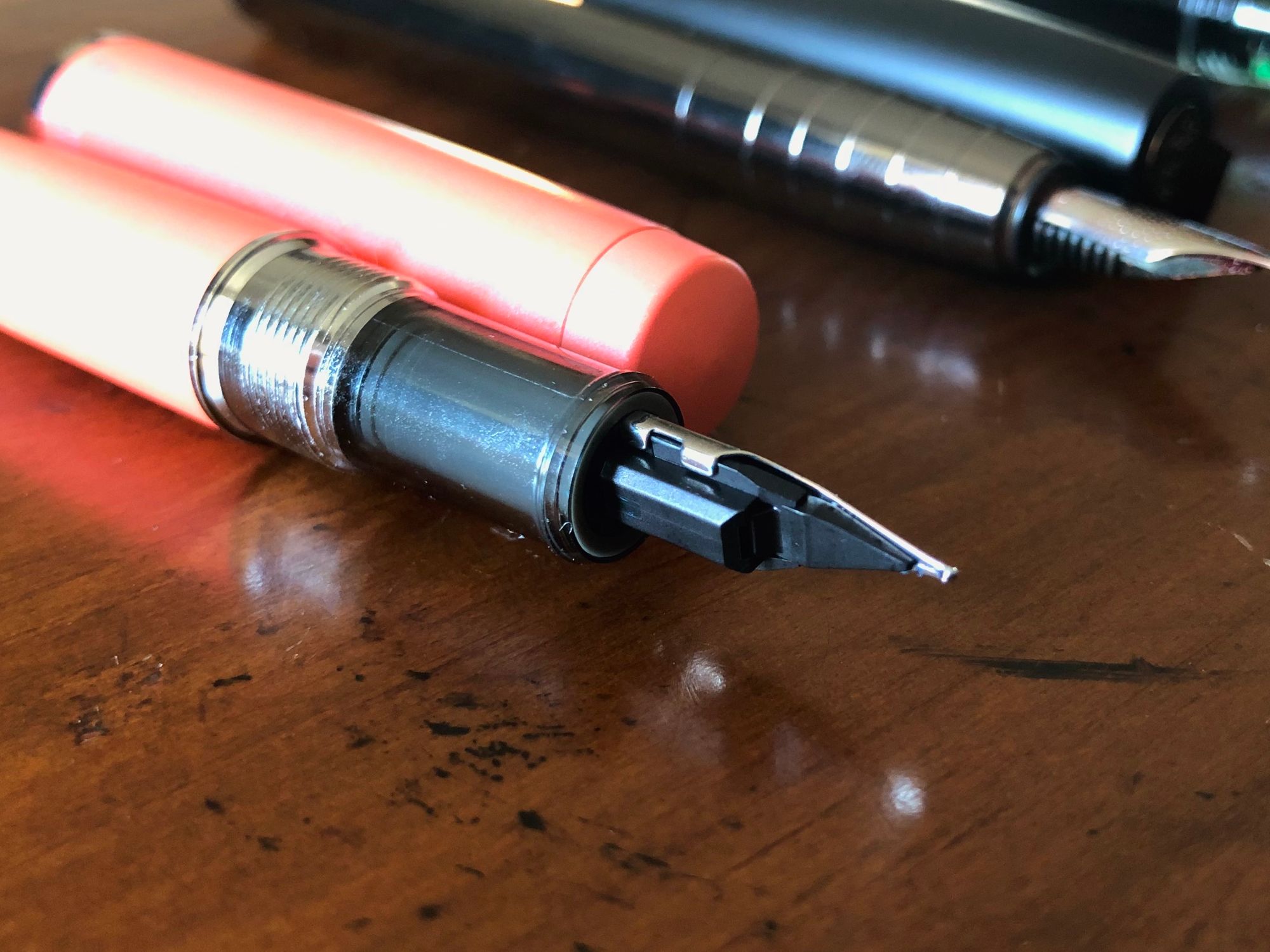 Platinum touts the design of their new feed pretty heavily in the marketing material for this pen. They placed the breather hole on the bottom of the plastic feed, further forward and more shallow than many other feeds have it. The idea is that the design will let you get all the way to the bottom of the an ink bottle and get up any last remaining drops in a bottle that’s almost empty. As a serial ink acquirer, I don’t often (okay, ever) find myself in a situation where I’m running low in an ink bottle, but it’s a neat idea nonetheless.